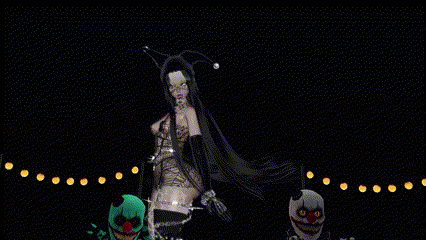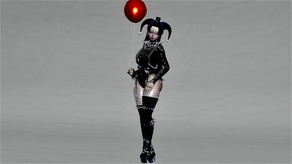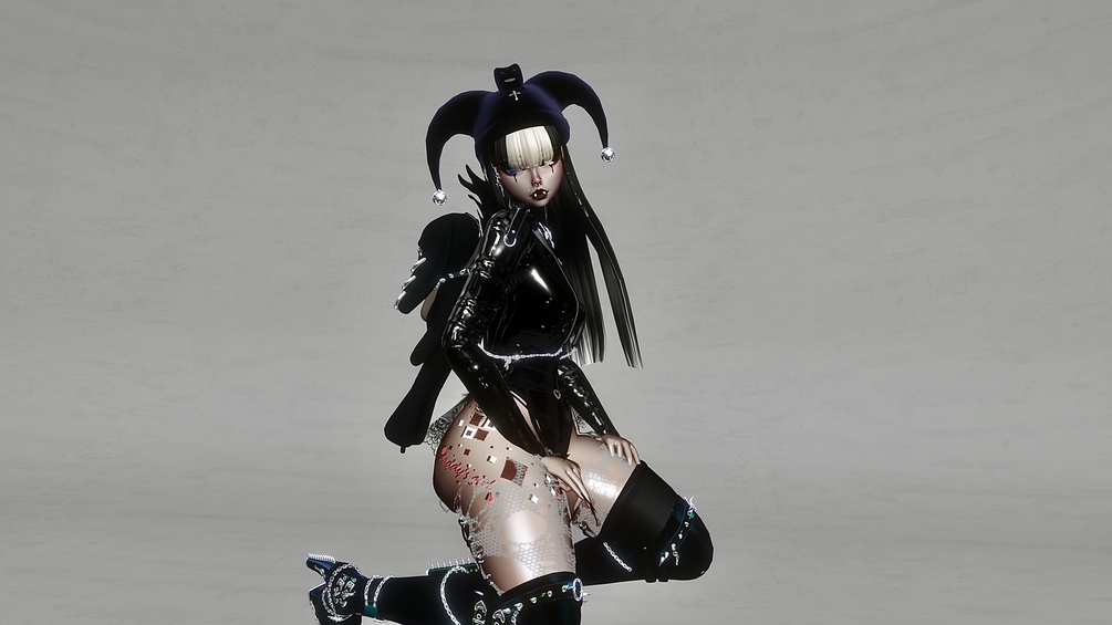 - Clothing: Leather Bodysuit, Webbed Dress, Bra, Pasties, Checkered Skirt, Lace Skirt, Lace Panties, Thigh High Socks, Tall Boots, Fluffy Heels